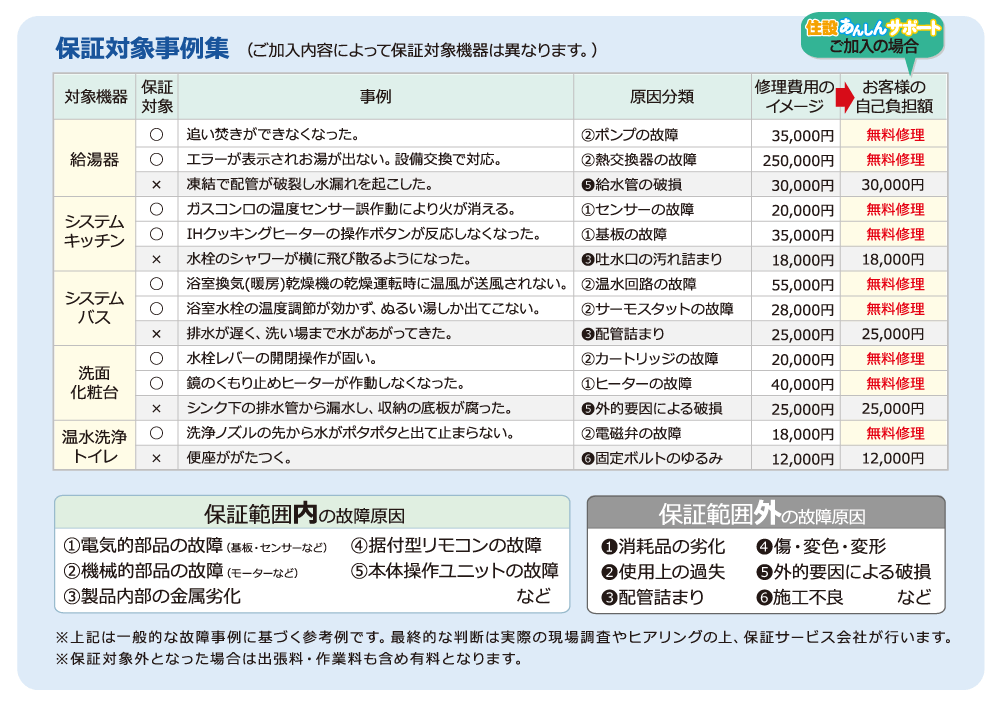 保証対象となる故障や不具合の修理・交換に関わる部品代、作業量、出張料など全て無料です。急な出費がなくなり、お客様の」家計の不安を解消します。