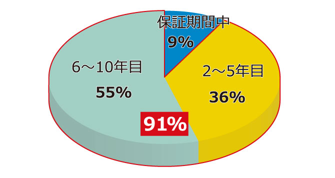 不具合発生率のトップ5はガスコンロの点火不良、換気扇の吸込み不良、水栓周りの不具合、トイレ洗浄ノズルの不良、給湯器の不具合です。新築の場合でも住宅設備機器の不具合は10年以内に2~3回発生しています。(2013年10月 日本リビング保証(株)調べ)